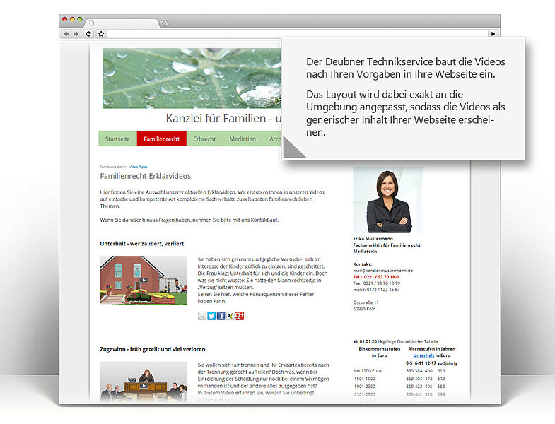 • Inklusive Einbauservice: Auf Wunsch baut der Deubner Technikservice die Videos nach Ihren Vorgaben in Ihre Kanzleihomepage ein